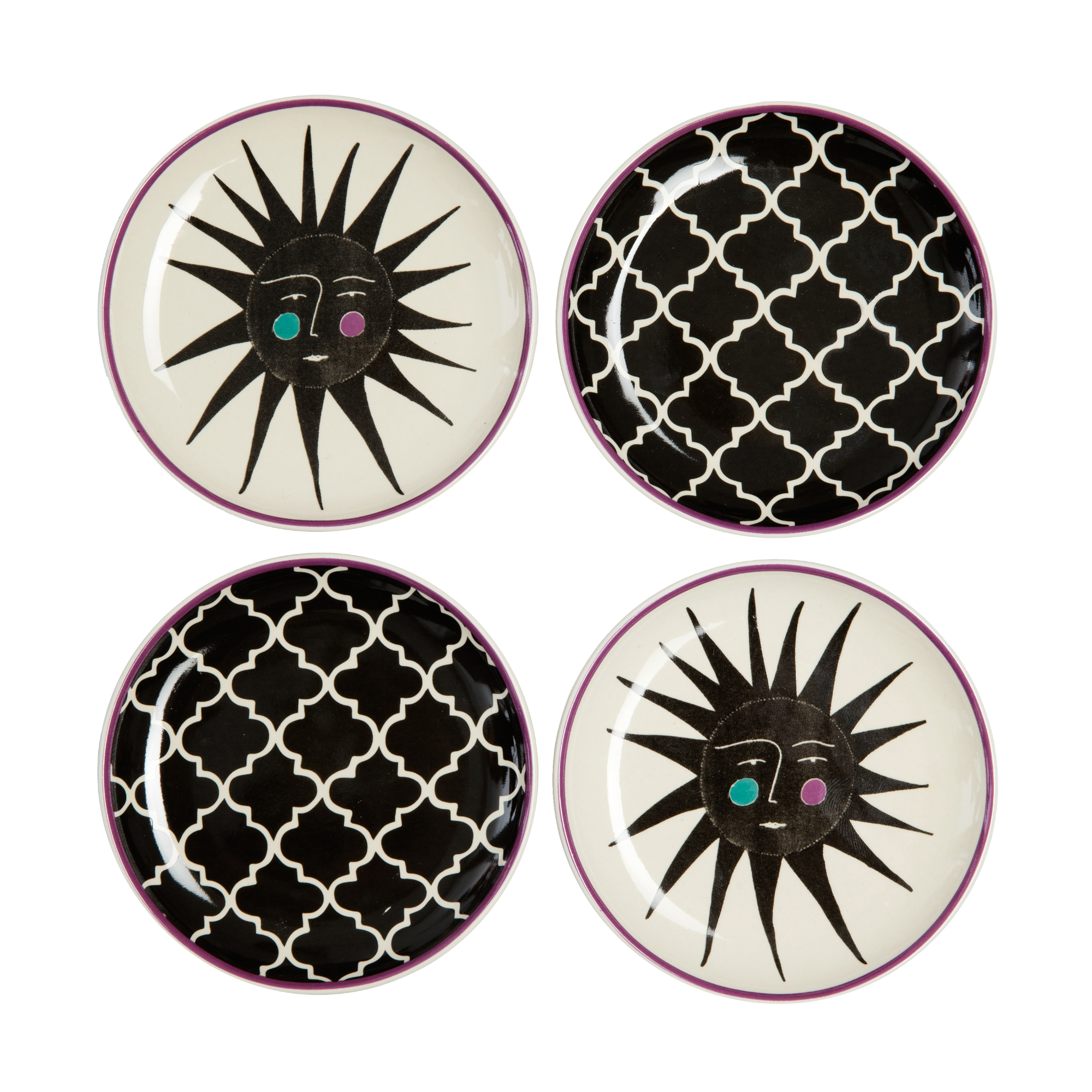 MALO small plates from our Geometric Sun collection. This product comes with four small plates as a set. Two of the plates feature the Geometric sun pattern, while the other two feature our distinct sun graphic.